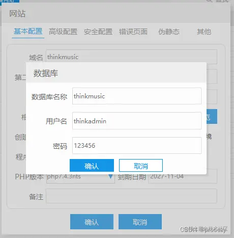 各项设置完成后,即可点击页面下方的“确认”按钮,生成ThinkMusic网站的运行环境。如果之后对网站的运行环境有任何变更,也可以点击条目右侧的“管理”按钮,在下拉菜单中进行修改。
