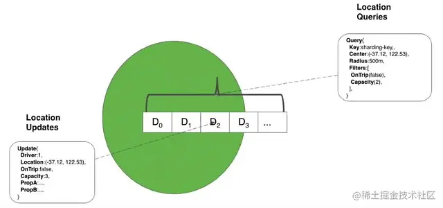 我们将在分布式索引中维护驾驶员位置,该索引分布在多个节点上。包含他们的位置、车内人数、是否在旅行的司机信息被聚合为对象。这些驾驶员对象在复制的同时,通过一些分片机制 (例如城市、产品等) 分布在各个节点上。