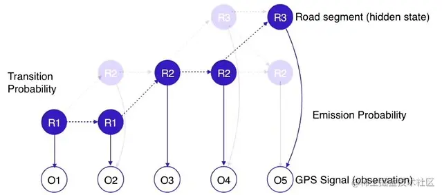 之后,利用发射概率 (从一个路段观察到 GPS 信号的概率) 和转移概率 (从一个路段过渡到另一个路段的概率),用隐马尔可夫模型 (HMM) 来表示 GPS 信号和路段。我们通过使用 HMM 将道路段建模为隐藏状态,将 GPS 信号建模为观测值,在图像中解释了这一场景。