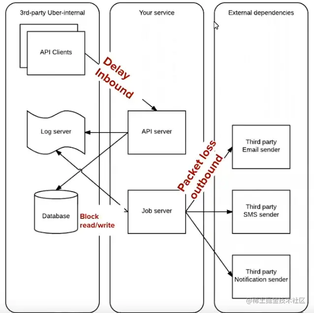 为了进行弹性测试,我们可以引入两种类型的中断。第一种故障被称为进程级故障,如 SIGKILL、SIGINT、SIGTERM、CPU 节流和内存限制。第二类故障是网络级故障,如入站网络调用的延迟、对外部依赖项的出站调用的丢包以及对数据库的阻塞读/写。我们已经在下图中展示了所有不同类型的网络故障。