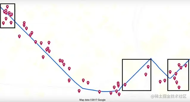 该模块将原始 GPS 信号作为输入,并输出路网上的位置。输入的 GPS 信号包括纬度、经度、速度和航向。另一方面,路网上的位置由纬度 (在实际道路上)、经度 (在实际道路上)、路段 id、道路名称和方向/航向组成。这本身就是一个有趣的挑战,因为原始 GPS 信号可能会远离实际的路网。下图中很少有这样的例子,左上角的盒子对应的是由高楼大厦造成的城市峡谷情况,右下角的盒子是由于 GPS 信号稀疏造成的。map Matcher 生成的地图路线用于两个主要用例:i) 寻找司机在路网上的实际位置 ii) 计算车费价格。
