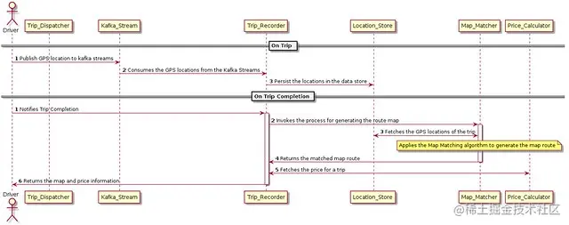 在下图中,我们展示了旅行进行和完成时所涉及的操作顺序。当乘车过程中,司机应用程序会发布 GPS 位置信息,这些信息会通过 Kafka 流被记录下来,并持久化到位置存储中。行程完成后,Map Matcher 使用原始 GPS 位置生成地图路线。