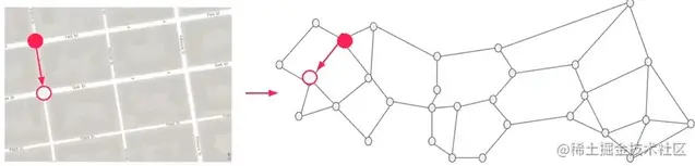 我们可以从用图形表示法表示物理地图开始,以方便路线计算。我们通过节点对每个路口进行建模,通过有向边对每个路段进行建模来实现这一点。我们已经在下图中展示了物理地图的图形表示。