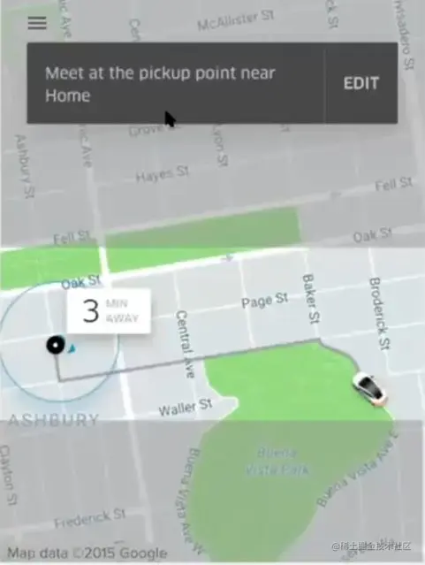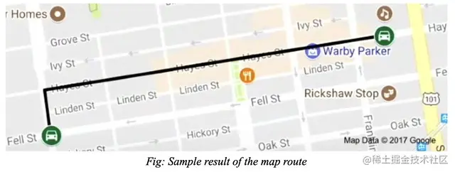 这个组件处理从旅行开始到完成所涉及的过程。当旅程进行时,它会跟踪旅程的位置。它还负责生成地图路线 (如下图所示),并在完成时计算行程成本。