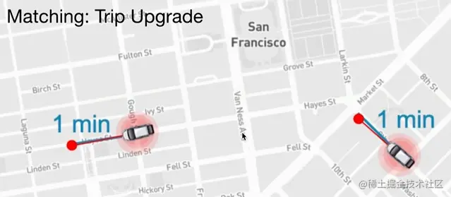 在上面的设计中,司机会被告知附近有乘客,他们会接受他们想要的乘车。作为现有实现的延伸,面试官可能会要求扩展系统,以实现司机与乘客的自动匹配。司机会根据司机和乘客之间的距离、司机移动的方向、交通状况等因素与乘客进行匹配。我们可以将天真的匹配骑手的方法应用到最近的司机身上。然而,这种方法并不能解决所谓的 trip_upgrade 的问题,即当一名乘客与一名司机匹配时,同时另一名司机和另一名乘客进入系统。trip_upgrade 的场景如下图所示。