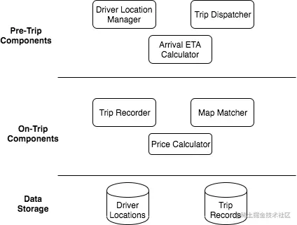 我们可以构建以下组件来支持这个行程生命周期。这些组件将协同工作,以满足构建网约车系统的要求。