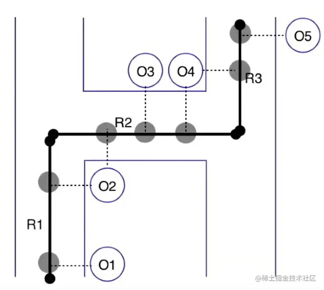 为了解决地图匹配问题,我们需要确定汽车在旅途中会走的路线。我们可以使用隐马尔可夫模型 (HMM) 的方法来找到全局最优路线 (路段集合; 即 R1, R2, R3,…),根据观测到的 GPS 信号 (O1, O2, O3,…),汽车会走哪条路。在下图中,我们展示了一个路段和 GPS 信号的样本表示。
