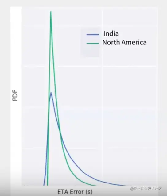 有趣的事实: 在这次 演讲 中,数据科学家 Sreeta Gorripaty @ Uber 讨论了 ETA 误差 (实际 ETA - 预测 ETA) 和区域之间的相关性。作为 特征工程 的一部分,ETA 误差的概率密度函数 (PDF) 如下图所示。从图中可以看出,与北美相比,印度的分布尾部较厚。这表明印度的 ETA 预测更差,使得区域成为训练用于 ETA 预测的机器学习模型的一个重要特征