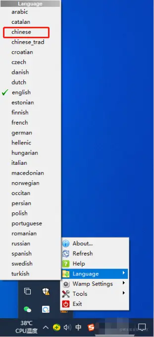当Wamp安装完成后,会在Windows系统托盘处出现一个小图标,我们可以右键点击这个小图标,更改Wamp的语言。