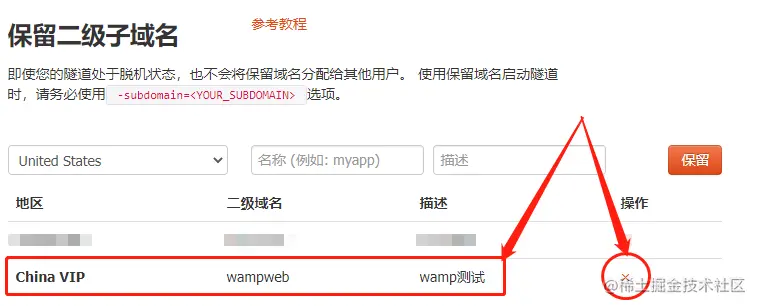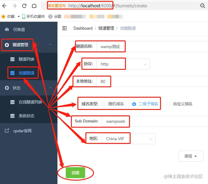 地区:服务器所在区域,就近选择即可二级域名:会最终出现在生成的公共互联网地址中,作为网络地址的标识之一描述:可以看做这条数据隧道的描述,能够与其他隧道区分开即可)。