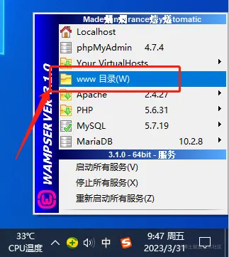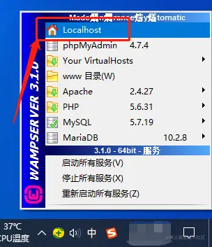 在所有网页运行相关服务都启动后,我们可以左键点击这个图标,并点选localhost选项,进入wamp的本地主页