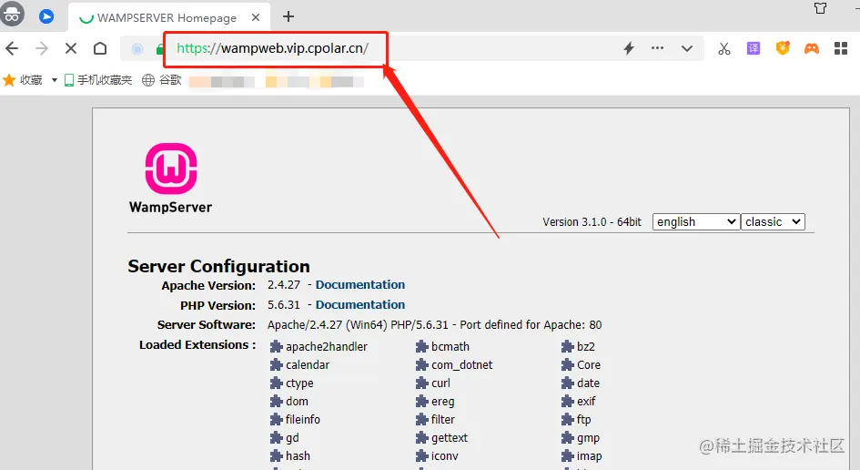 我们将这个地址粘贴到其他设备浏览器中,就能看到本地wamp的页面。也就意味着本地wamp网页已经打破信息孤岛的限制,成功在公共互联网上发布。