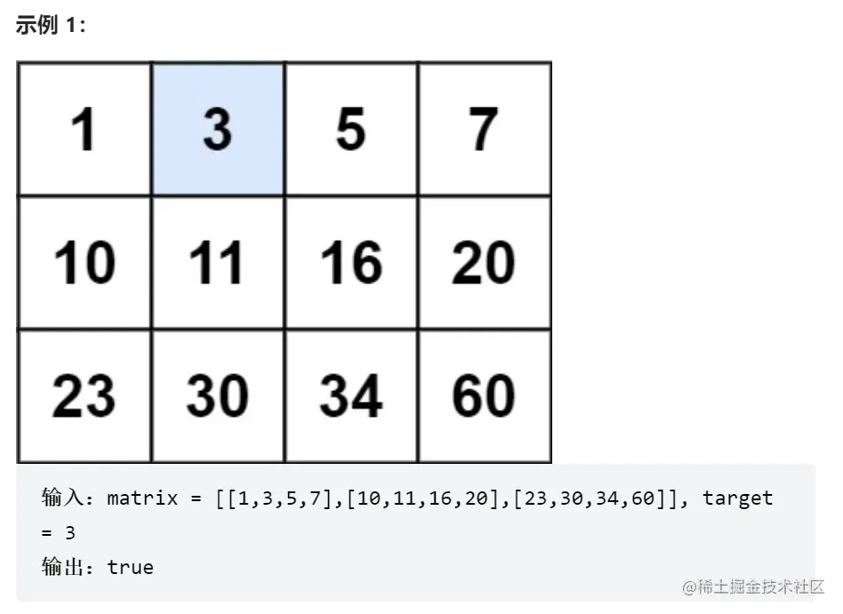 Q:给定一个 mxn 的二维矩阵,编写一个高效算法来判断矩阵中是否存在目标值,该矩阵里的元素有如下特点: