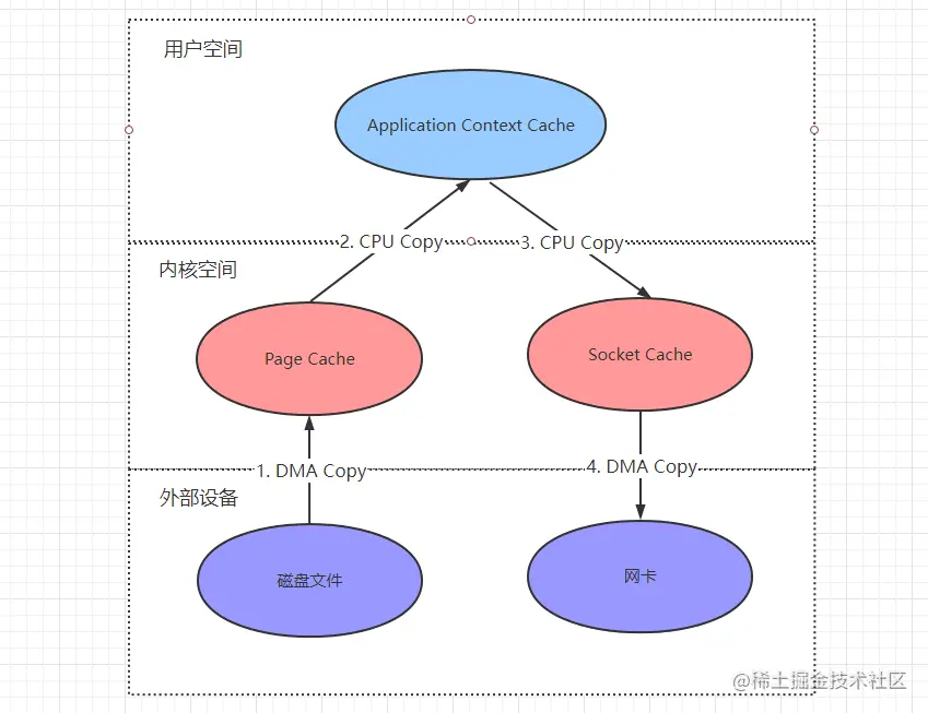 - 将 Socket Cache 的数据,通过 DMA Copy 操作复制到网卡,由网卡进行网络传输。
