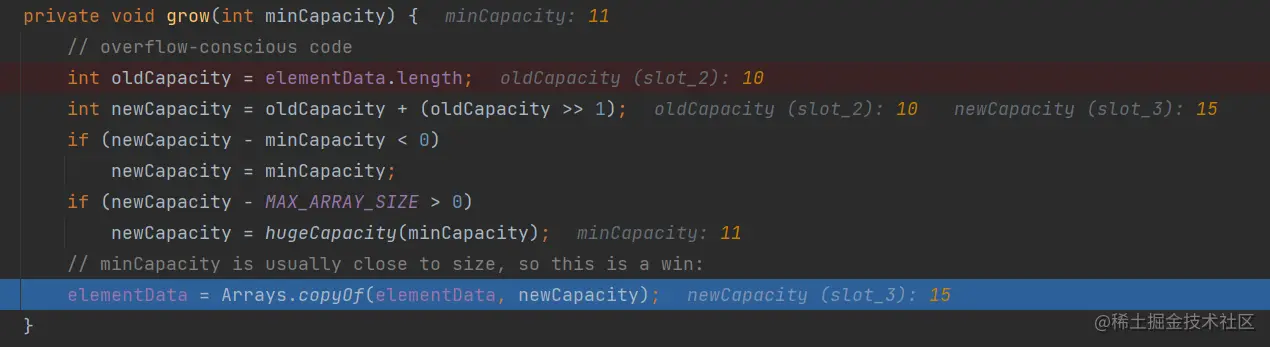 直到添加第 11 个元素,minCapacity(为 11)比 elementData.length(为 10)要大。进入 grow 方法进行扩容。