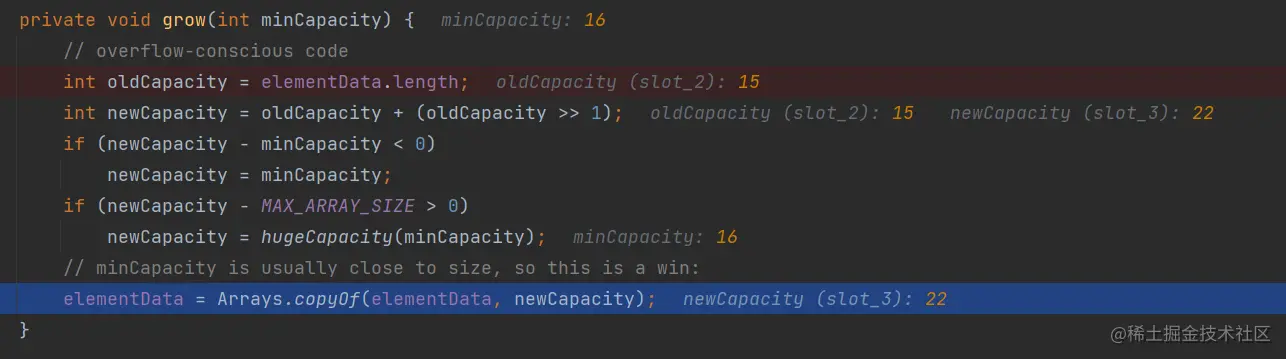 - 以此类推,当add到16个元素的时候,newCapacity为 15+7=22,比minCapacity大,第一个 if 判断不成立。新容量没有大于数组最大 size,不会进入 hugeCapacity 方法。数组容量扩为 22,add 方法中 return true,size 增为 16。