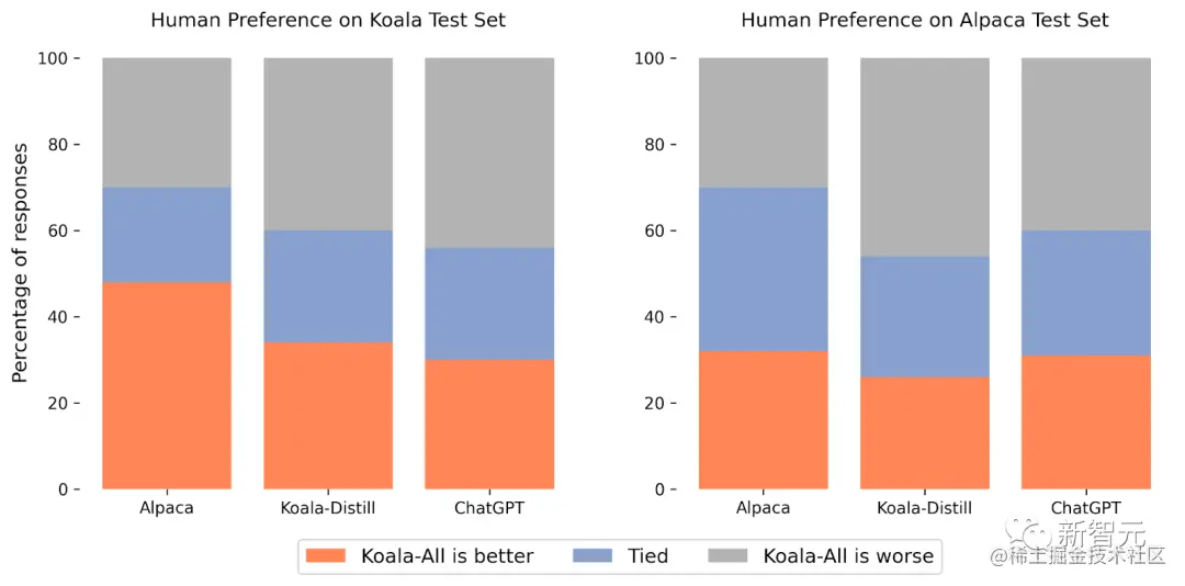 在 Alpaca 测试集中,Koala-All 的表现与 Alpaca 相当。