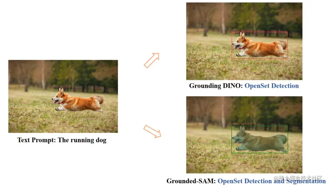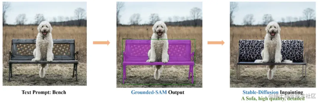 具体来说,他们使用一个 SOTA 的 zero-shot 目标检测器(Grounding DINO)提取物体 box 和类别,然后输入给 SAM 模型出 mask,使得模型可以根据文本输入检测和分割任意物体。另外,他们还将其和 Stable Diffusion 结合做可控的图像编辑。