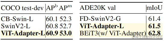 但是,这种最朴素的结构由于缺乏必要的与图像相关的归纳偏置,相较于 ViT 替代增强版会导致较慢的收敛过程和较低的下游任务性能。所以,这篇文章提出了一种用于使得 ViT 架构适配下游密集预测任务的 Adapter。ViT 模型,加上这种 Adapter 之后,下游下游密集预测任务的性能变强不少,即: