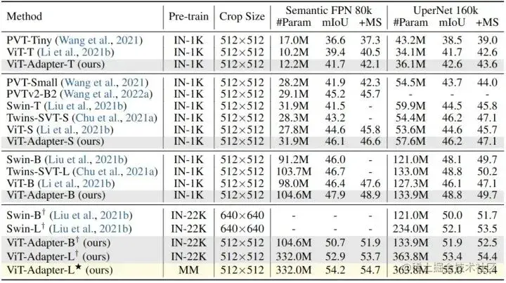作者使用 DeiT 发布的 ImageNet-1K 权重 (无蒸馏) 作为所有 ViT-T/S/B 模型的初始化,可以看到,本文方法 ViT-Adapter 超过了 ViT 和许多具有代表性的视觉 Transformer。ViT-Adapter-S 使用 UperNet 达到了 47.1 MS mIoU,优于 Swin-T。同样,ViT-Adapter-B 达到的 49.7 MS mIoU 比 ViT-B 高2.6分,与 Swin-B 相当。这些结果表明,仅通过常规的 ImageNet-1K 预训练,ViT- adapter 就可以使普通 ViT 获得与这些 Swin 等模型相似甚至更好的性能。通过更大的 ImageNet-22K 预训练的模型也展示出了类似的结果。
