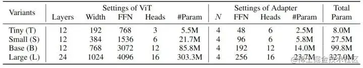 作者为4种不同大小的 ViT 构建了 ViT-Adapter,包括 ViT-T,ViT-S,ViT-B,ViT-L。对于这些型号,Adapter 参数量分别为 2.5M、5.8M、14.0M 和 23.7M。作者使用[7]Deformable Attention 作为默认的稀疏注意力,采样点的数量固定为4。此外,作者将 FFN 的 Expansion Ratio 设置为0.25以节省计算开销。对于4个不同的适配器,FFN 的 Embedding diemnsion 大小分别为48、96、192和256。具体配置如下图3所示。