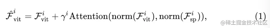 空间特征注入器如图2 (d) 所示, 用于将空间先验注入到 ViT 模型中。具体而言, 对于 ViT 的第 个块, 搞一个交叉注意力机制 (Cross-Attention), 以输入特征 作为 Query, 空间特征 作为 Key 和 Value, 如下式所示: