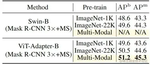 作者还研究了多模态预训练的效果。使用不同的预训练权重对 ViT-Adapter-B 与 Mask R-CNN 的方案进行微调,实验结果如下图6所示。只需将 ImageNet-22K 预训练替换为多模态预训练,就可以获得0.7的 APb 和 APm 的显著增益。这些结果表明,Adapter 可以很容易地从先进的多模态预训练中获得相当大的收益,这对于 Swin 等特定于视觉的模型来说是很难的。