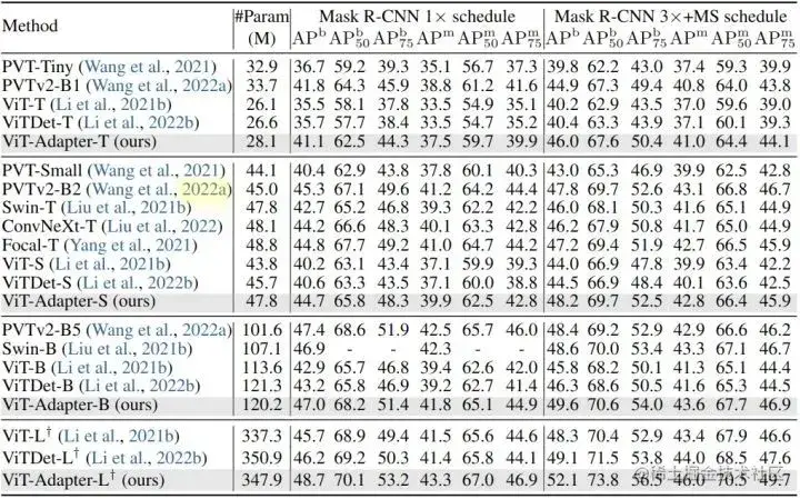 ViT-S 和 ViTDet-S 分别比 PVTv2-B2 低 3.8 APb 和 3.3 APb。ViT-Adapter-S的性能明显优于这两种方法,甚至比PVTv2-B2 高出 0.4 APb。这种观察也同样适用于其他3个检测器。这些结果表明,仅通过常规的 ImageNet-1K 预训练,ViT- adapter 就可以使普通 ViT 获得与这些 PVT 等模型相似甚至更好的性能。通过更大的 ImageNet-22K 预训练的模型也展示出了类似的结果。