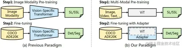 为了弥补这个遗憾,本文提出了 ViT-Adapter,只用 ViT 作为密集预测任务的基本架构,不使用任何花里胡哨的替代增强版 (Vision-Specific Transformer)。使用最原始的 ViT,就是为了利用它跨模态学习 (multi-modal pre-training) 的强大潜质。当迁移到下游的密集预测任务时,使用一个无需预训练的 Adapter 将与图像相关的归纳偏置引入 ViT,使其适合这些任务。