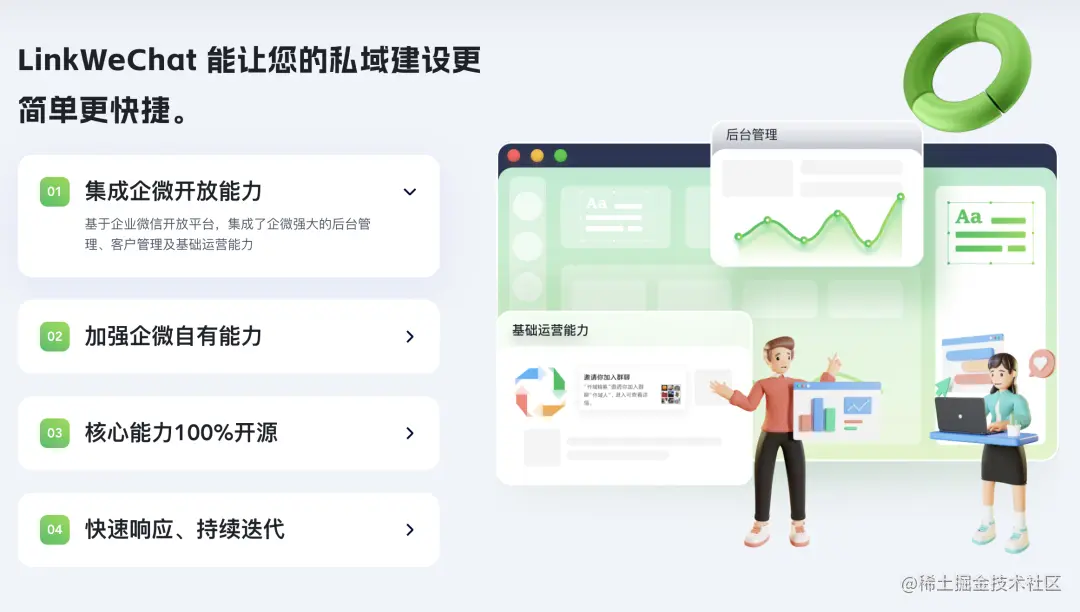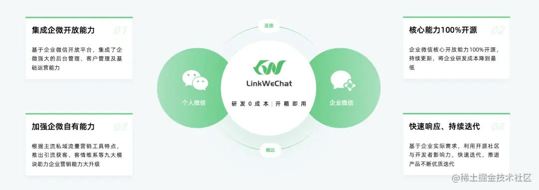 LinkWeChat 基于企业微信开放能力,不仅集成了企微强大的后台管理及基础的客户管理功能,而且提供了多种渠道、多个方式连接微信客户。并通过客情维系、聊天增强等灵活高效的客户运营模块,让客户与企业之间建立强链接,从而进一步通过多元化的营销工具,帮助企业提高客户运营效率,强化营销力,拓展盈利空间。