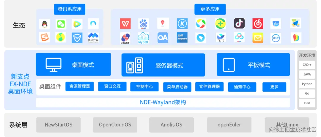 新支点 EX-NDE 桌面环境分为两大主体:桌面组件和 NDE-Wayland 架构。