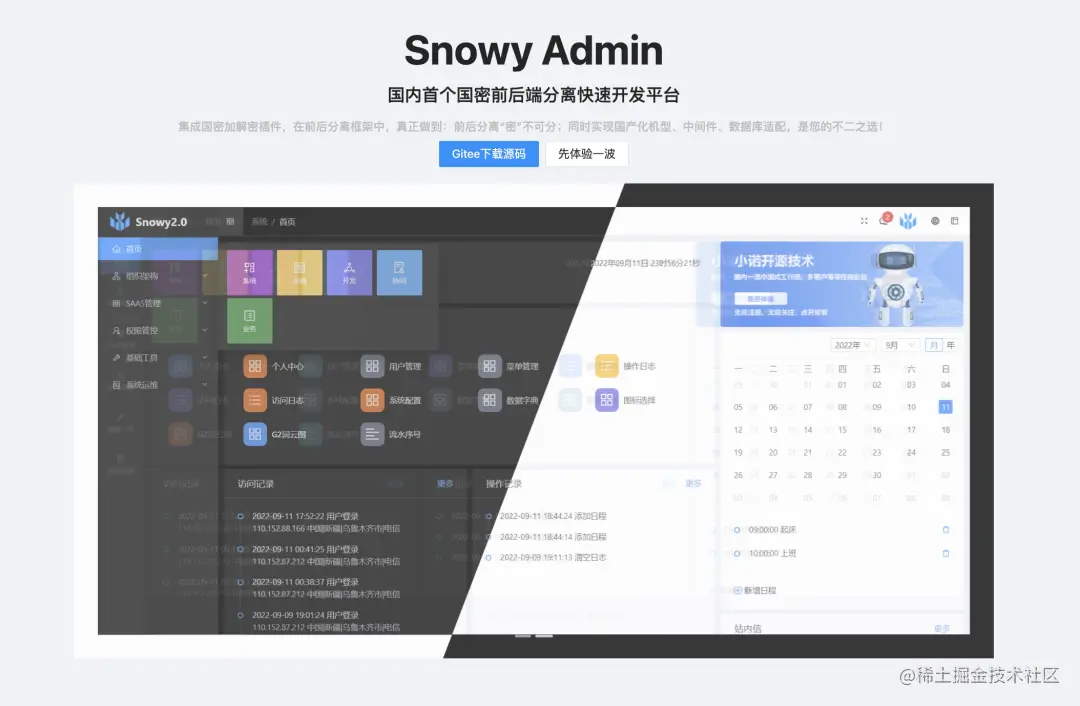 Snowy(SnowyAdmin)是国内首个国产化前后端分离快速开发平台,集成国密加解密插件, 软件层面完全符合等保测评要求,同时实现国产化机型、中间件、数据库适配,是您的不二之选!技术框架与密码结合,让更多的人认识密码,使用密码;更是让前后分离 “密” 不可分。采用 SpringBoot+MybatisPlus+AntDesignVue+Vite 等更多优秀组件及前沿技术开发,注释丰富,代码简洁,开箱即用!