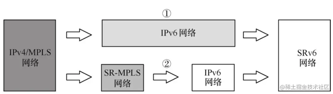 图7-2是两条典型的SRv6网络的演进路线。第一条是从IPv4/MPLS网络→SRv6网络,第二条是IPv4/MPLS网络→ SR-MPLS网络→ SRv6网络。