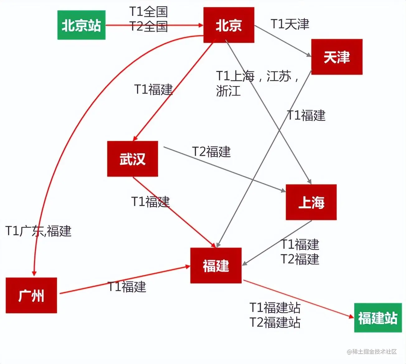 - 表示:如果放置在整个路由网络资源中,一个标记T1的货物要从北京发往福建,可选的路由有①北京站-北京-武汉-福建-福建站;②北京站-北京-广州-福建-福建站;之所以剔除了北京站-北京-上海-福建-福建站以及北京站-北京-武汉-上海-福建-福建站,正是因为后两条线路中未包含T1的配载代码,只标记了T2 ,说明这条线路只有配载航空的货物,而没有普通陆运的带货能力。