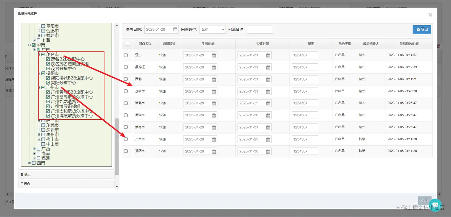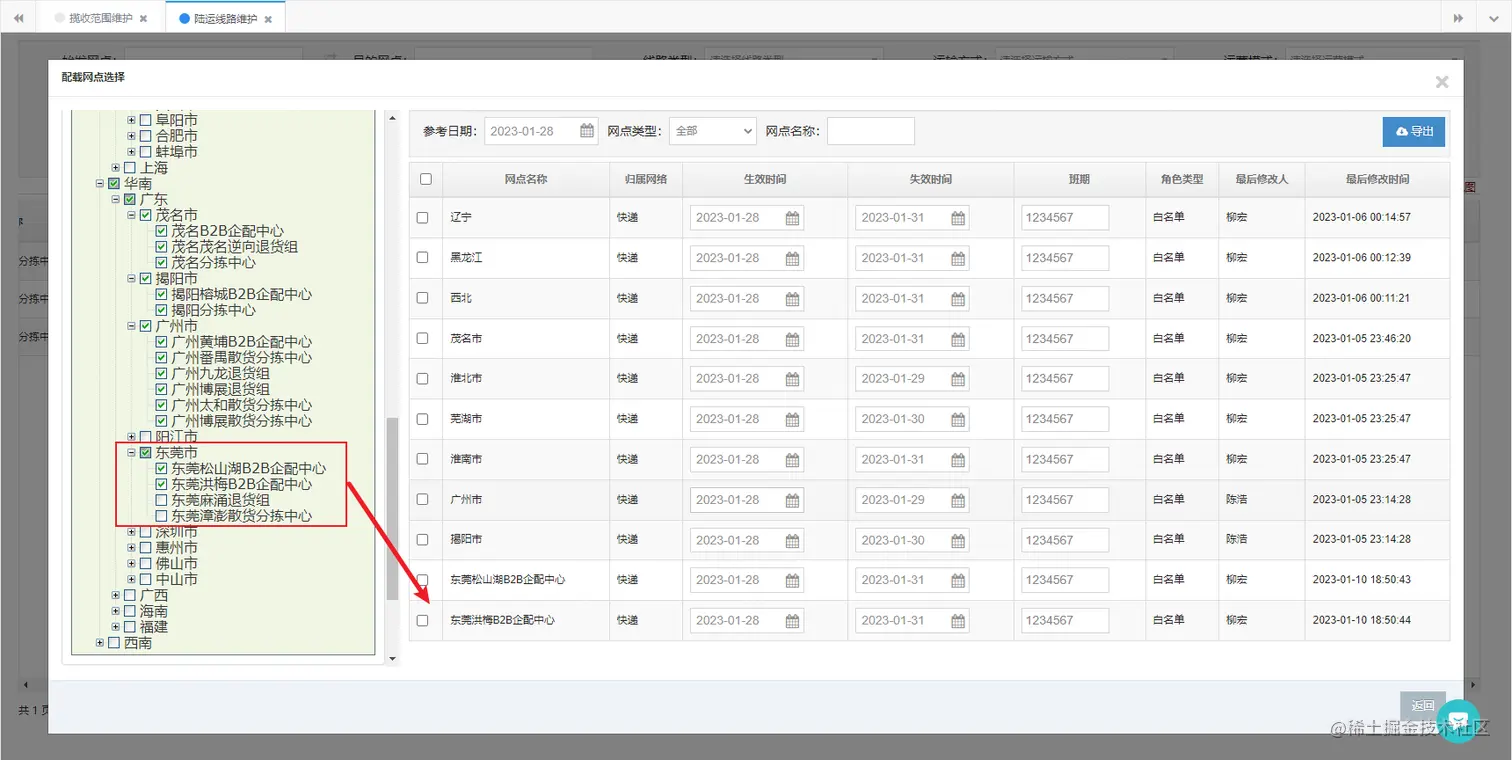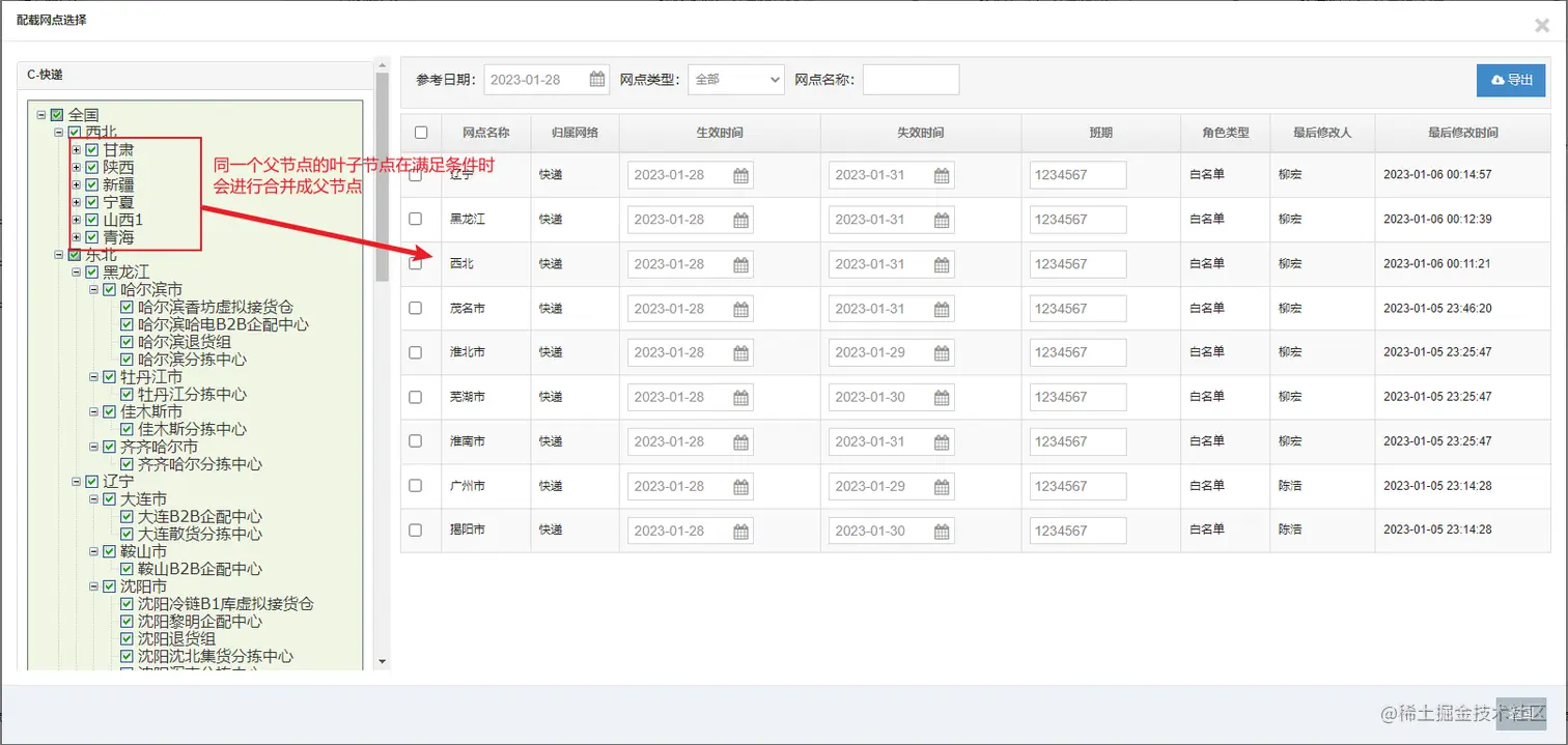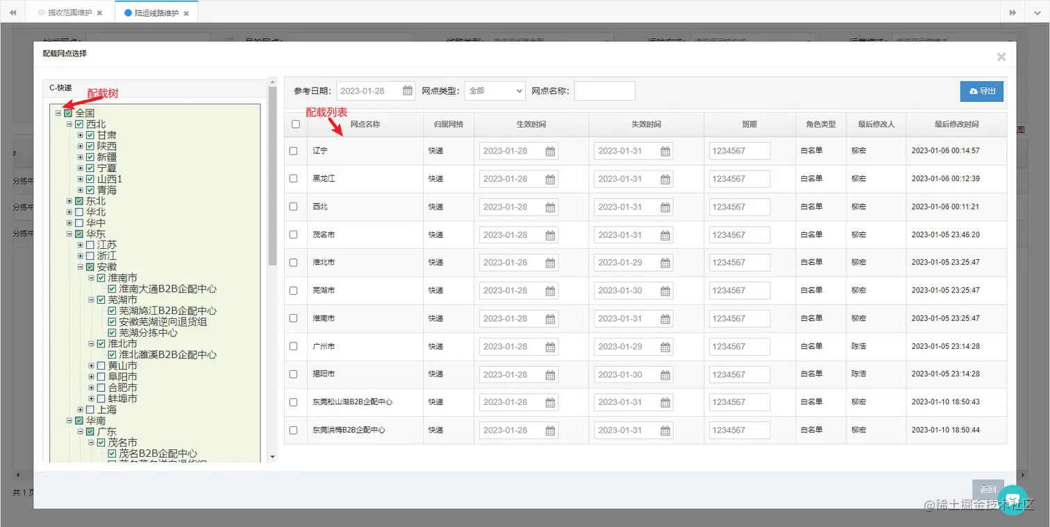 - 网点四级地址的关系以配载树的形式展现,勾选节点添加的配载在右侧的配载列表中展示