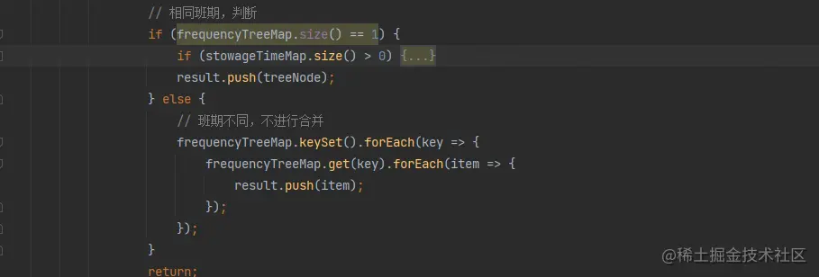 对frequencyTreeMap集合进行判断,如果数量为1表示 与该节点同级的节点班期相同,触发了合并,将节点加入结果集返回;否则说明当前节点的同级节点存在不同班期,不能进行节点向上合并,直接遍历frequencyTreeMap中的value集合,加入结果集返回