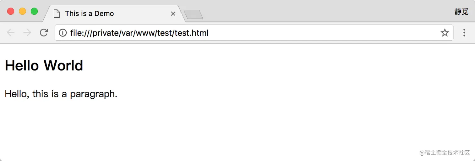 可以看到,在选项卡上显示了 This is a Demo 字样,这是我们在 head 中的 title 里定义的文字。而网页正文是 body 标签内部定义的各个元素生成的,可以看到这里显示了二级标题和段落。