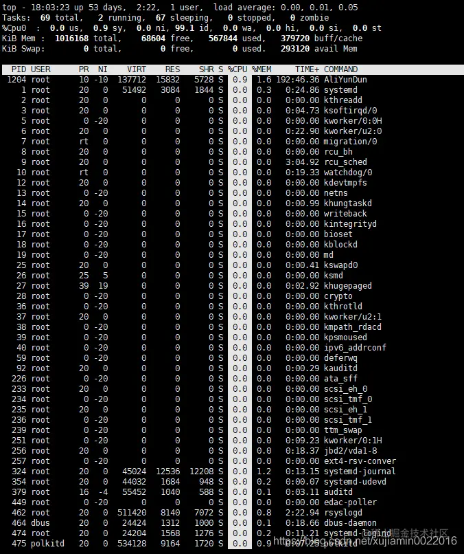 第1行:top - 17:29:09 up 53days, 1 users, load average: 0.00, 0.01, 0.05