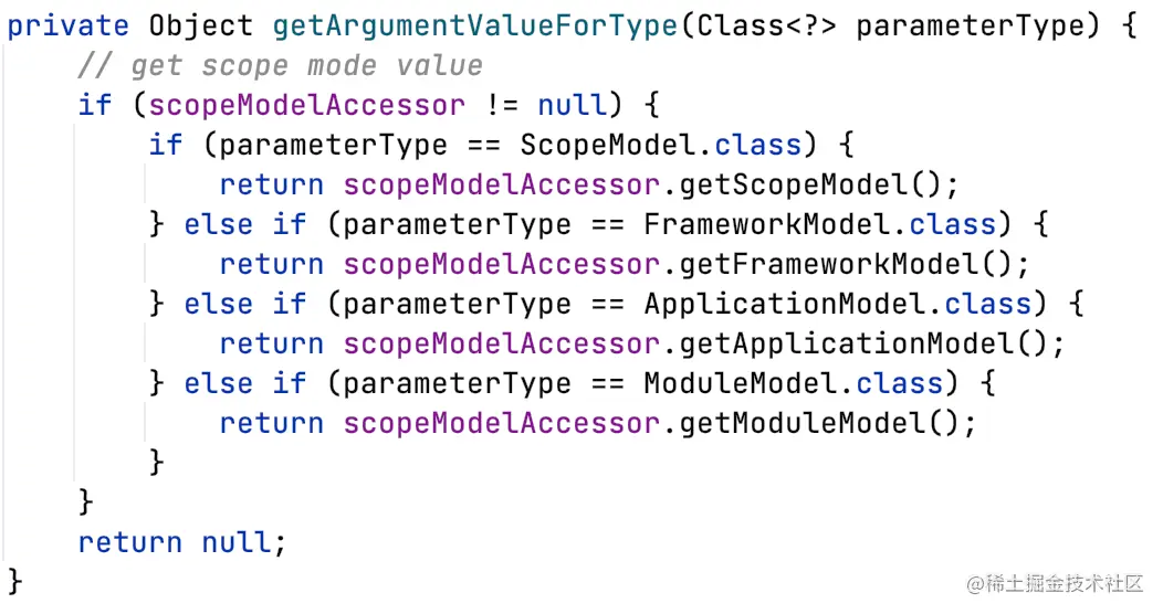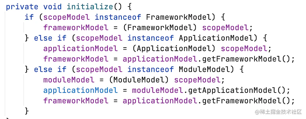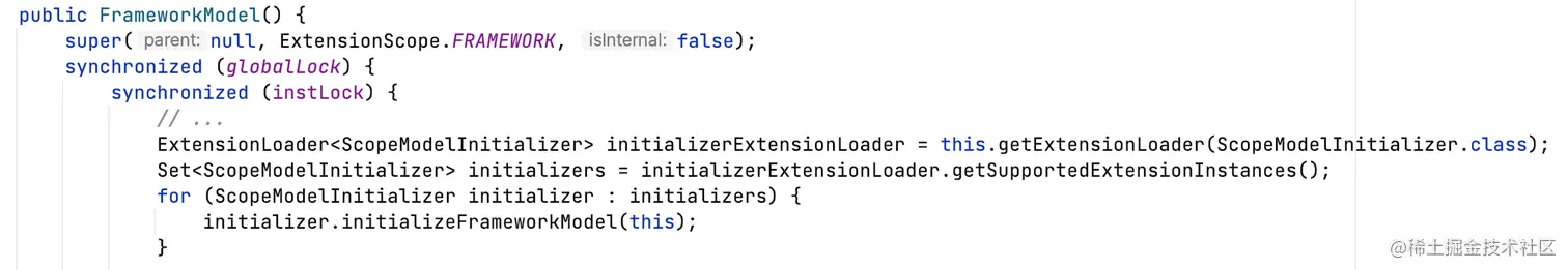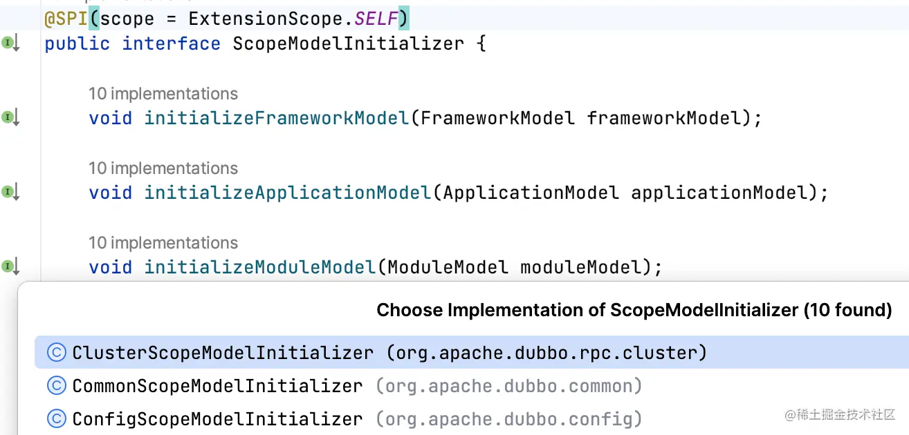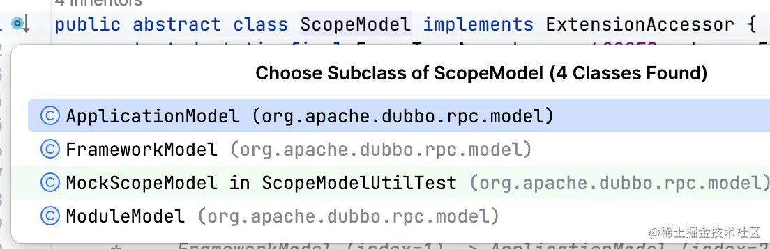 如果scope=Framework,通过ModuleModel/ApplicationModel也能获取到,且module、application、framework具备父子关系的三个ScopeModel都会拿到同一个扩展点实现。
