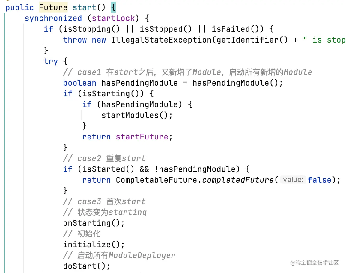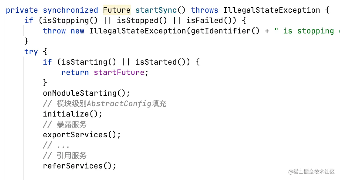 DefaultModuleDeployer#start:可以由上层ApplicationDeployer#start触发,也可以主动启动