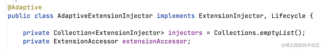 和2.x相同,通过一个自适应扩展AdaptiveExtensionInjector,循环所有ExtensionInjector,获取setter方法的type+name对应实现实例。