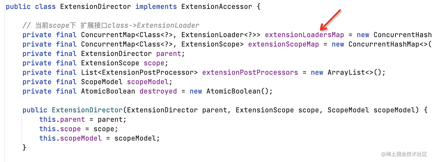 ExtensionDirector存储一个scope范围中扩展接口class对应ExtensionLoader,从而实现了不同scope管理自己的ExtensionLoader实例。
