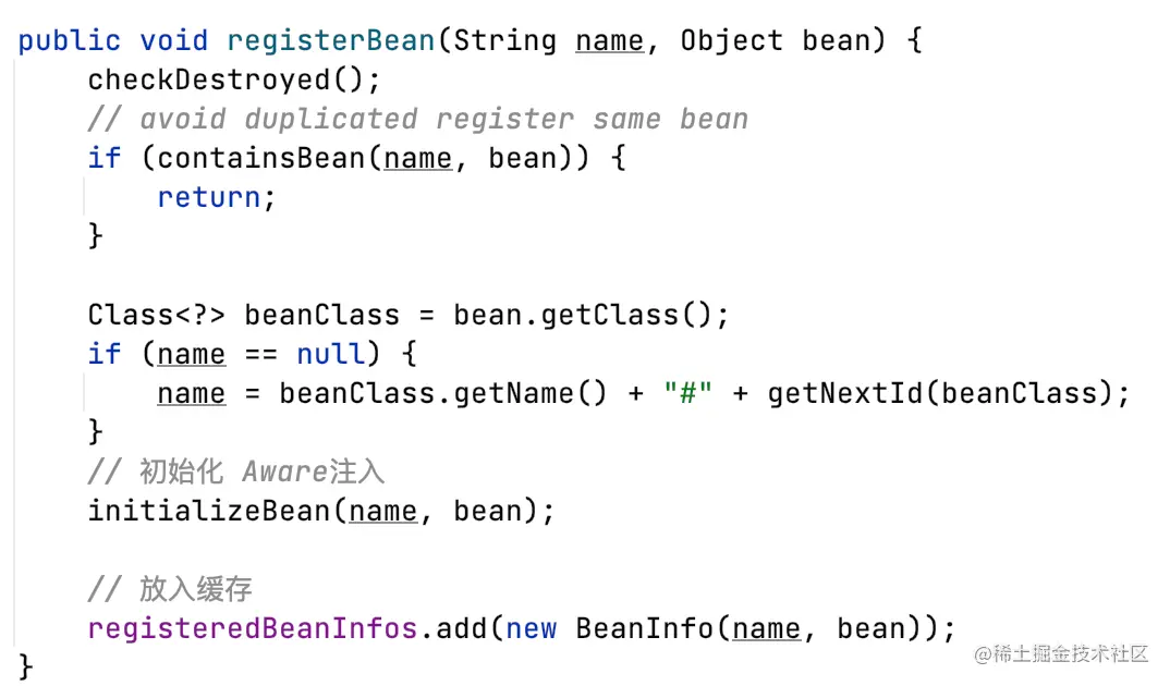 无论是基于Class注册还是基于instance直接注册,最终都会执行初始化Aware注入,放入beanFactory缓存。
