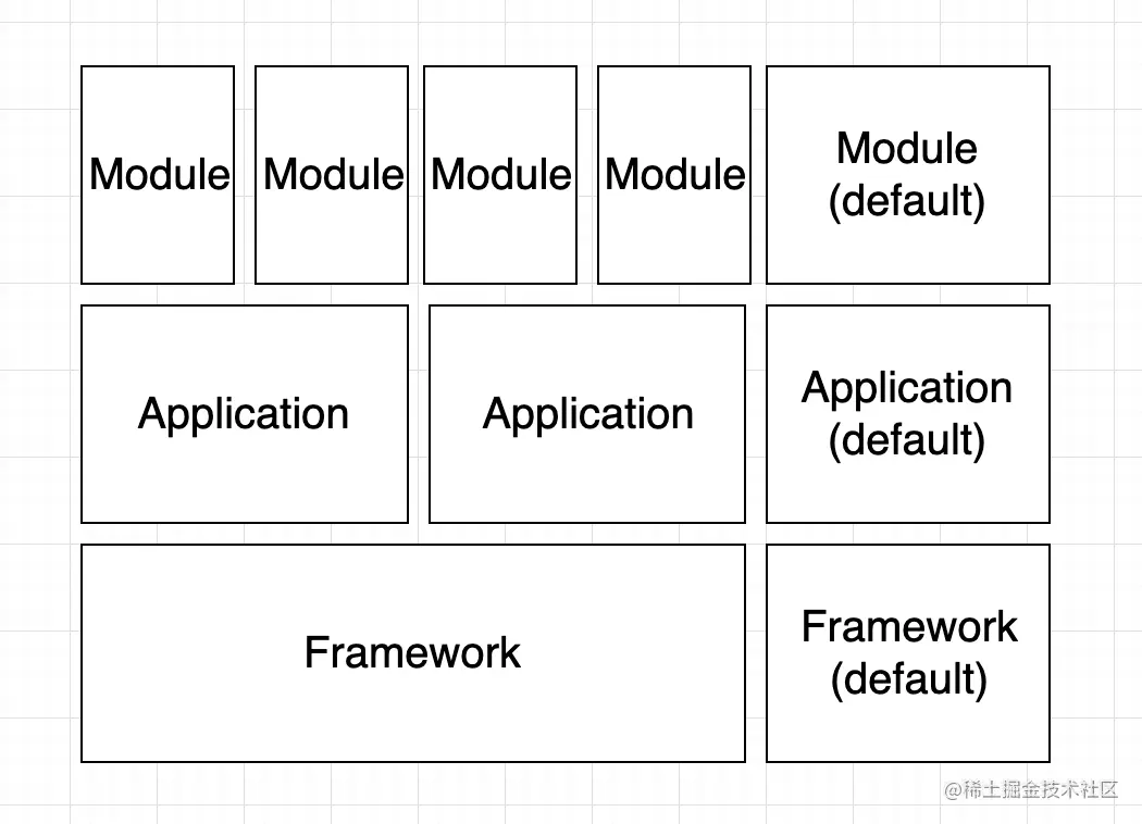 双亲关系:Framework最大,接着是Application,最后是Module。