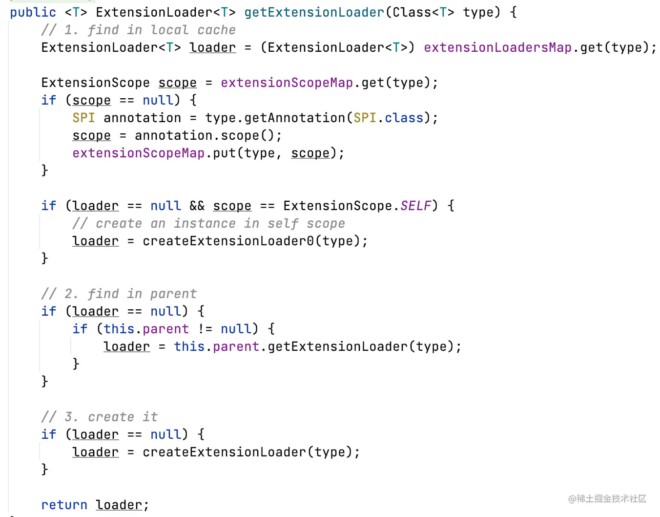 3)parent找不到,自己判断scope是否和扩展点SPI注解scope一致,一致才创建ExtensionLoader;