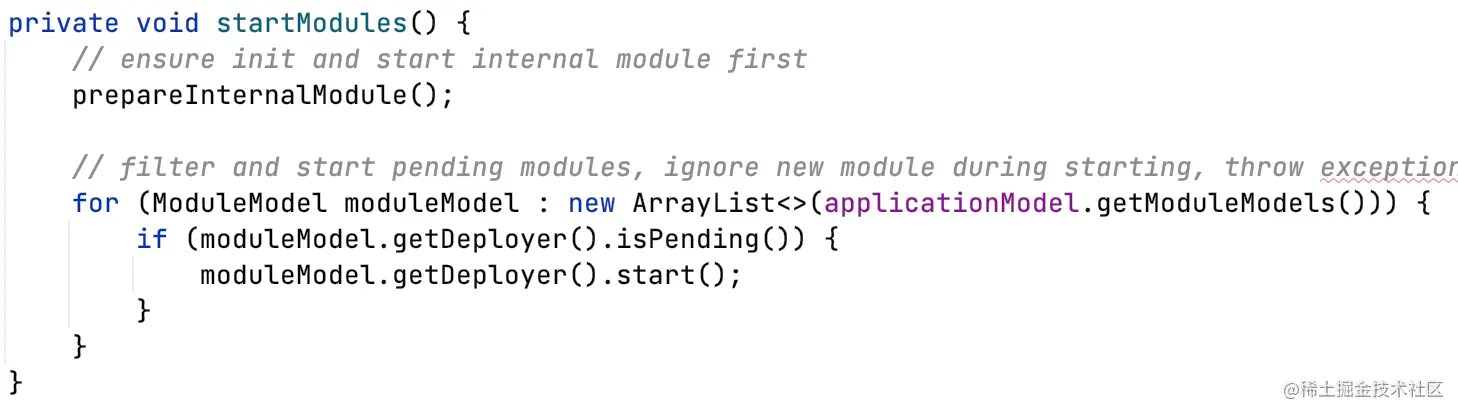 2)DefaultApplicationDeployer#startModules:启动ApplicationModel下所有模块的ModuleDeployer