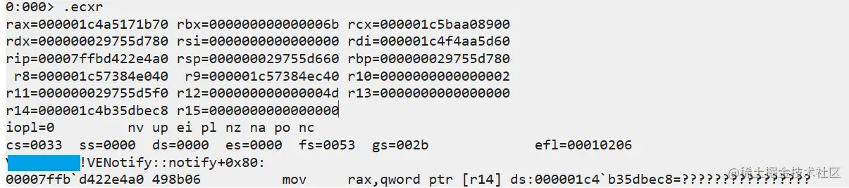 执行.ecxr恢复异常现场也可以证明,此crash和空指针无关。只是一个内存访问违例。