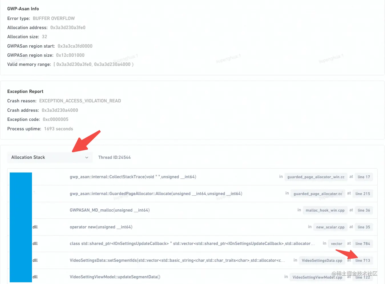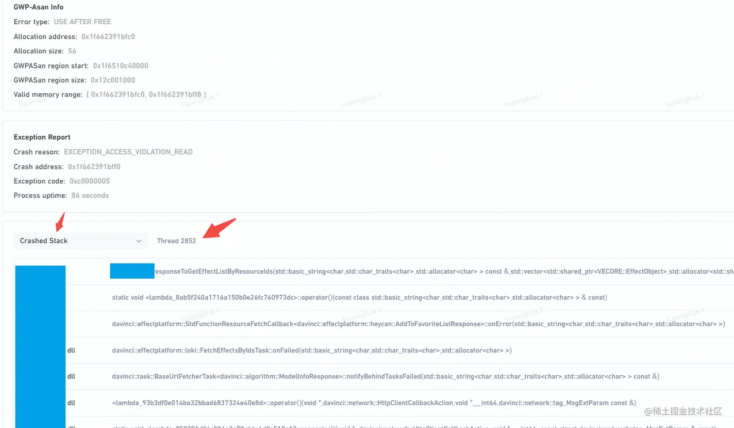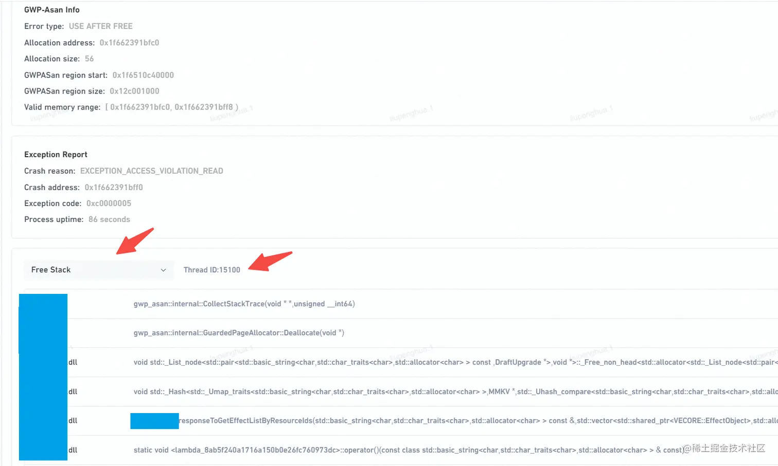 幸运的是,GWP-ASan也抓到同位置的crash了,我们看下GWP-ASan的crash输出: