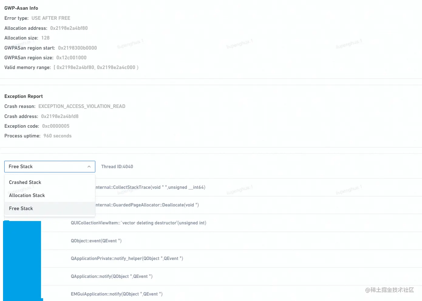 如果我们不是作者的话,不了解程序逻辑,当观察到char * ``encryptText`` = 0x00000254a6a6e870 "U???" ,我们很可能会怀疑是堆破坏了(后面了解了代码逻辑后知道,这个地方内存是正确的)。我们针对问题用户单独开启了GWP-ASan,很快GWP-ASan捕获到同位置的crash。