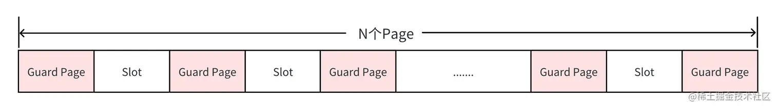 首先,我们需要保留一块连续的n*page size的受保护内存池。其中,可分配内存的page是Slot,不可分配内存的page是Guard Page。Slot和Guard Page间隔分布,整个内存池最前和最后都是Guard Page,所有的Slot都受到Guard Page保护,之后应用分配的堆内存将随机采样分配到这些Slot上。